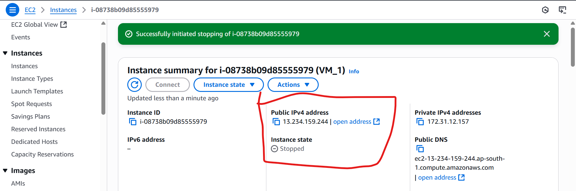 However, this IP is ephemeral—stopping and restarting the instance releases the Public IP, and a new one (e.g., 13.235.79.233) is assigned.